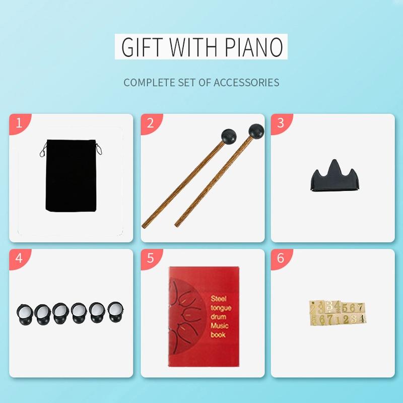 De kit bevat een 6-inch steel tongue drum, drumstokken en een draagtas.