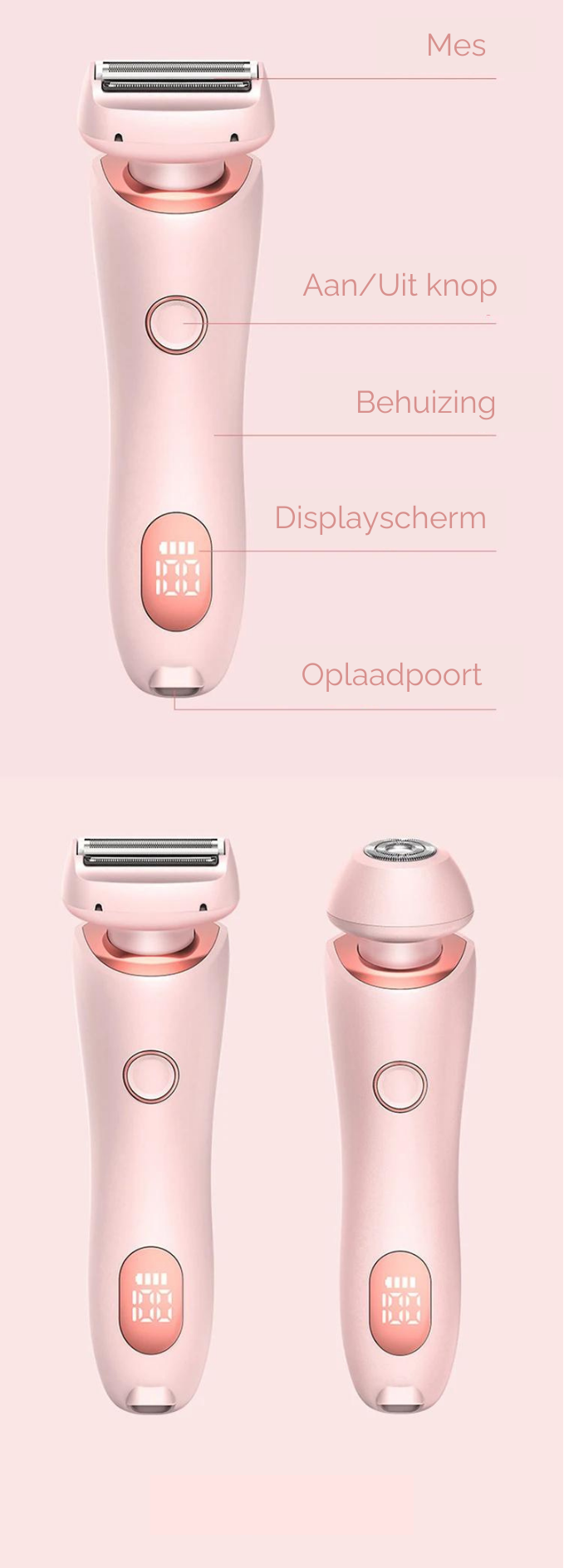 Kop 2 bestaat uit een ronde kop speciaal ontworpen voor moeilijk bereikbare en gevoelige gebieden zoals oksels en bikinilijn.